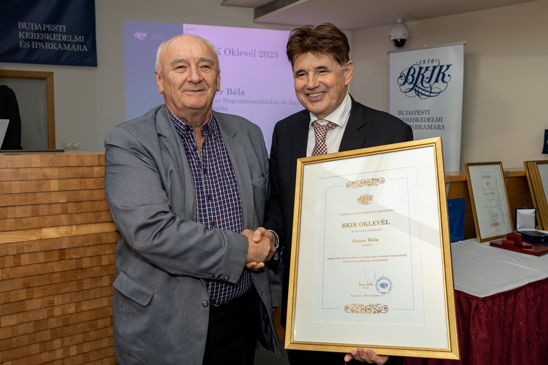 The Budapest Hungarian Industrial and Trade Chamber by the chairman Elek Nagy, issued an educational prize to CEO Bella Gayer, MHtE for his outstanding work to improve VET in Hungary.
